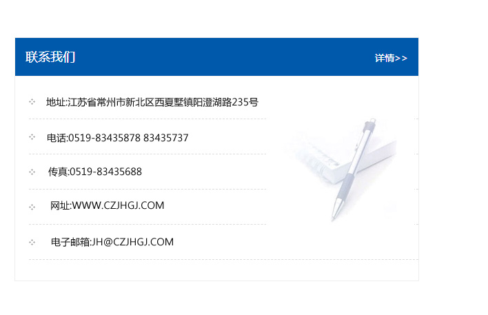 地址:常州市新北區友邦商務大廈1幢16、17層  電話:0519-85101652  傳真:0519-85112595  郵編:213022  網址:www_cz-jiayue_cn.hyd828.com  郵箱:xiajifengaa@163.com